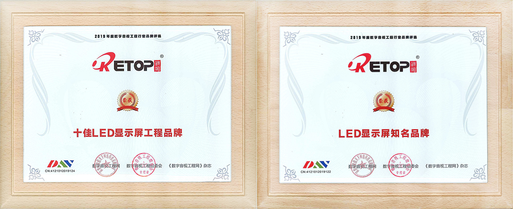 由數(shù)字音視工程網(wǎng)、數(shù)字音視工程組委會(huì)、《數(shù)字音視工程》雜志主辦的“十佳LED顯示屏工程品牌”“LED顯示屏知名品牌”評(píng)選活動(dòng),經(jīng)過(guò)廠家、設(shè)計(jì)院、經(jīng)銷商、工程商、終端客戶、媒介從業(yè)人員網(wǎng)絡(luò)無(wú)記名投票后產(chǎn)生初選名單,再由數(shù)字音視工程行業(yè)的權(quán)威專家對(duì)入圍企業(yè)的產(chǎn)品研發(fā)實(shí)力、市場(chǎng)占有率、用戶滿意度等諸多指標(biāo)進(jìn)行綜合評(píng)定后,在2019年年底,獲獎(jiǎng)名單重磅出爐!集團(tuán)旗下顯示屏品牌RETOP榮膺“2019年十佳LED顯示屏工程品牌”“2019年LED顯示屏知名品牌”兩項(xiàng)殊榮!